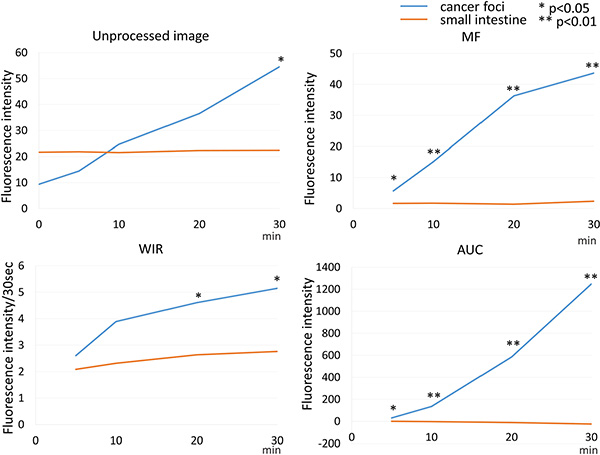 Figure 7: Time fluorescence intensity curve of the cancer foci and small intestine on unprocessed images, MF, WIR, and AUC maps using 2.5 μM gGlu-HMRG. Difference between cancer foci and small intestine was examined at each time point.