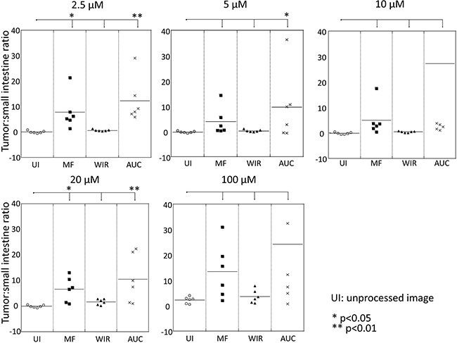 Tumor:small intestine ratio (T:SI) of unprocessed images was approximately zero up to 20 μM. On the other hand, T:SI of the three parameters tended to demonstrate higher ratios compared to ratios of unprocessed images regardless of concentration of gGlu-HMRG (Figure 12). Using 2.5 μM and 20 μM gGlu-HMRG, the T:SI using MF and AUC was significantly higher than the T:SI using unprocessed images (p = 0.03, 0.68 and < 0.01 for MF, WIR, and AUC at 2.5 μM, and p = 0.05, 0.52 and < 0.01 for MF, WIR, and AUC at 20 μM, respectively). Using 5 μM gGlu-HMRG the T:SI of the AUC was significantly higher than that of unprocessed images (p = 0.35, 0.71 and 0.04 for MF, WIR, and AUC, respectively). Using 10 μM and 100 μM gGlu-HMRG there was no significant difference in T:SI for all three parameters compared to that of unprocessed images (p = 0.63, 0.74 and 0.15 for MF, WIR, and AUC at 10 μM, and p = 0.29, 0.70 and 0.05 for MF, WIR, and AUC at 100 μM, respectively).