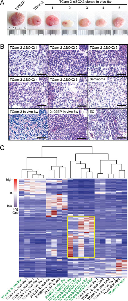 Figure 1: (A) Macroscopical appearance of tumors from xenografted TCam-2, 2102EP and TCam-2-∆SOX2 clones. (B) HE staining of tumor tissues from xenografted TCam-2-∆SOX2 clones, parental TCam-2 and 2102EP. A seminoma and an EC tissue were stained as controls. Scale bars: 50 μm. (C) Meta-analysis of expression microarray data of indicated samples including unsupervised hierarchical clustering. Samples labelled in green were generated for this study, samples in black are part of a previous publication [10] and re-analyzed in context of this study. The yellow box highlights genes differentially expressed between TCam-2-∆SOX2 clones and the other samples.