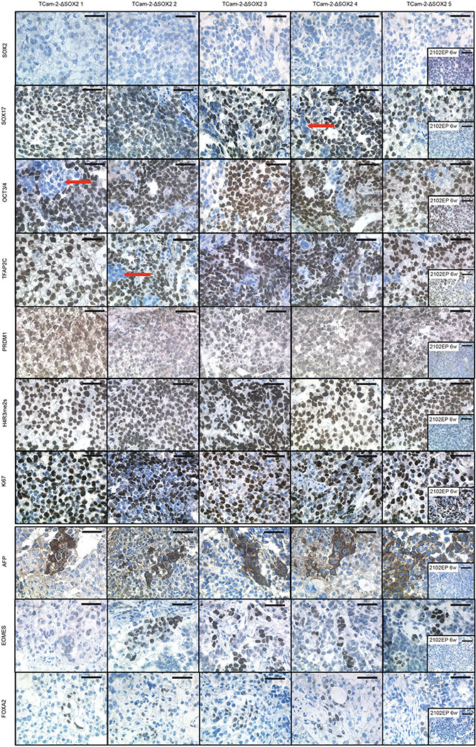 Figure 3: IHC staining of indicated proteins in TCam-2-∆SOX2 clones. Tumor tissues from xenografted 2102EP cells were stained as control. Scale bars: 50 μm.