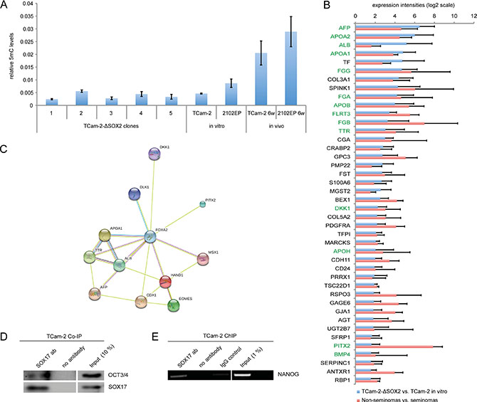Figure 5: (A) Quantification of 5mC levels in tumors from xenografted TCam-2-ΔSOX2 clones, TCam-2 and 2102EP cells. In vitro cultivated TCam-2 and 2102EP served as controls. (B) Commonly expressed genes in TCam-2-ΔSOX2 (vs. TCam-2 in vitro) and non-seminomas (n = 7) (vs. seminomas (n = 4)) based on microarray data. Green labeled genes are related to FOXA2. (C) STRING analysis of FOXA2 interacting genes. (D) Co-IP experiment in TCam-2 demonstrating binding of SOX17 to OCT3/4. (E) ChIP experiment in TCam-2, demonstrating binding of SOX17 to the SOX2 / OCT3/4 binding motif within the NANOG promoter.