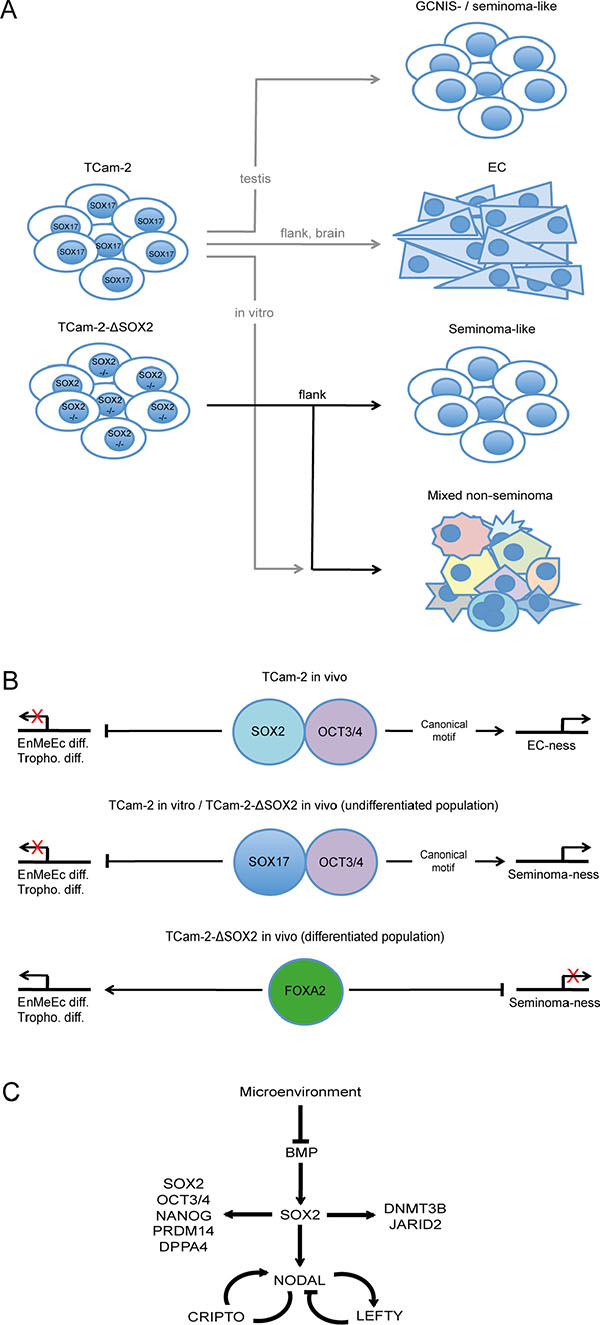 In this study, we generated SOX2-deficient TCam-2 cells by the CRISPR/Cas9 technique and xenografted these cells into the flank of nude mice. Molecular analyses of the tumors demonstrated a seminoma-like morphology and gene expression profile, suggesting that SOX2 is essential for induction of an EC-like cell fate. In TCam-2-∆SOX2 clones, BMP signaling related molecules ID1 and ID3 were downregulated, which is indicative for reduced BMP signaling activity. However, activation of NODAL (early during reprogramming of TCam-2) and WNT (late during reprogramming) signaling and upregulation of pluripotency and EC markers GDF3, DPPA3, DNMT3B, ZIC3, PRDM14 failed to occur [10]. Thus, SOX2 appears to be downstream of BMP signaling but upstream of NODAL activation. Our ChIP analysis in 2102EP suggested that SOX2 regulates expression of LEFTY1/LEFTY2 and CRIPTO, allowing for establishment of the NODAL signaling loop. In vitro treatment of TCam-2 cells (SOX2 negative) with recombinant NODAL was not sufficient to activate NODAL signaling [10]. So, expression of SOX2 is a prerequisite for activation of NODAL signaling. Furthermore, our ChIP experiments demonstrated binding of SOX2 to key factors of pluripotency and ECs (SOX2, DPPA3, DNMT3B, PRDM14, GDF3). In conclusion, SOX2 is an essential factor in acquiring the EC-like cell fate from GCNIS or seminoma.