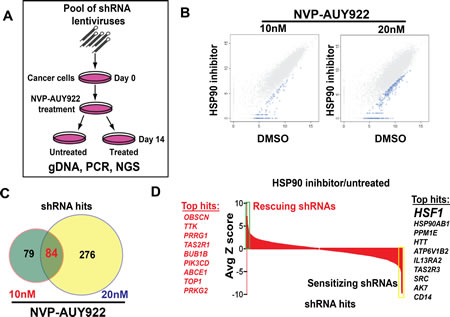 Figure 1: Pooled shRNA screening reveals that HSF1 as a top sensitizer to HSP90 inhibitor. A. The schematic of pooled shRNA screening experiment design. B. Scatter plots of log2 normalized read counts from pooled shRNA screening performed in A375 cells treated with 10nM/20nM NVP-AUY922 or control dimethyl sulfoxide (DMSO) samples. Hairpins that were statistically significantly depleted in NVP-AUY922 treated samples were highlighted in blue color. Each dot in the plot represents one individual shRNA construct. C. Venn diagram showed that 163 shRNAs were identified in lower dose NVP-AUY922 and 360 shRNAs were identified from higher dose NVP-AUY922 from pooled shRNA screening performed in A375 cell. 84 shared shRNAs were found between two experiments. D. Average Z score of shRNA hits from pooled shRNA screening performed in A375 cells was shown in a waterfall plot. Top sensitizing genes including HSF1 were highlighted in yellow color while top rescuing genes were shown in green.