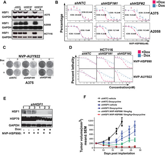 Figure 2: HSF1 knockdown sensitizes cancer cells to HSP90 inhibitor in vitro and in vivo. A. Western blotting analysis of HSF1 knockdown in A375, A2058 and HCT116 cells. shNTC or shHSF1 transduced stable cell lines were treated with Doxycycline for 3 days and cell pellets were collected and western blotting was performed. B. IC50 of HSP90 inhibitor with or without HSF1 knockdown. shNTC or shHSF1 transduced cancer cells were treated with or without Doxycycline for 3 days, then followed by treatment of a serial dilutions of NVP-HSP990 for 5 days. Relative cell growth (average of at least 3 independent experiments) was measured by CellTiter-Glo and normalized to DMSO-treated cells. C. Cell colony formation assay of HSF1 knockdown with HSP90 inhibitor treatment. shNTC or shHSF1 transduced A375 cells were treated or untreated with Doxycycline for 5 days, then followed by compound treatment for 6 days. D. LD50s of HSP90 inhibitors: NVP-AUY922 and NVP-HSP990 with or without HSF1 knockdown in HCT116 cells. shNTC or shHSF1 transduced cancer cells were treated with or without Doxycycline for 3 days, then followed by being treated for 5 days with serial dilutions of NVP-HSP990 or NVP-AUY922. Relative cell growth (average of at least 3 independent experiments) was measured by CellTiter-Glo. Cell relative death rate was calculated. E. Western blotting analysis of tumor samples. Tumor samples were collected at the end of studies and western blotting analysis of HSF1, HSP70 and GAPDH were performed. F. The combinational effect of HSF1 knockdown and HSP90 inhibitor in A375 xenograft mouse model. Tumor growth rate of A375 cells expressing inducible control shRNA or shRNA against HSF1 under Doxycycline and/or NVP-HSP990 were compared at different time points. Tumor inhibition effects were calculated relative to control group at day 20.