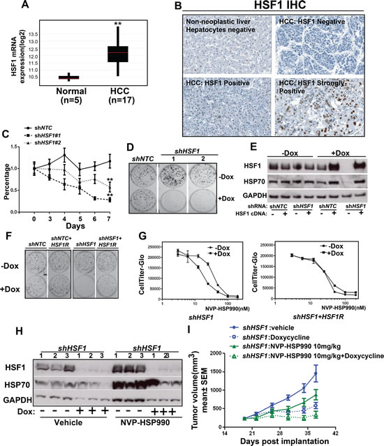 Figure 3: HSF1 knockdown sensitizes hepatocellular cancer cells to HSP90 inhibitor in vitro and in vivo. A. The mRNA level of HSF1 was measured among tumor samples from HCC patients compared to normal control. B. IHC showed the expression of HSF1 in primary human hepatocellular cancer. C. The cell growth curve of Hep3B cell with or without HSF1 knockdown at different time points. shNTC or shHSF1 transduced Hep3B cells were treated with or without Doxycycline for 7 days. Relative cell growth (average of at least 3 independent experiments) was measured by CellTiter-Glo and normalized to cells without Doxycycline treatment. D. Cell colony formation assay of HSF1 knockdown in Hep3B cells. shNTC or shHSF1 transduced Hep3B cells were treated with Doxycycline for 12 days. E. Western blotting analysis of Hep3B cells expressing the indicated shRNA and cDNA contruct. The inducible lenti-virus construct (HSF1R cDNA) was used to transduce Hep3B cells and expression of HSF1R cDNA with or without HSF1 knockdown were tested. HSF1, HSP70 and GAPDH were detected by western blotting. F. Cell colony formation assay of over-expression of HSF1R cDNA in Hep3B cells with or without HSF1 knockdown. G. The comparison of dose response of NVP-HSP990 in Hep3B cells with inducible expression of either HSF1 shRNA alone or both HSF1 shRNA and HSF1R cDNA. HSF1 shRNA alone or both HSF1 shRNA and HSF1R cDNA transduced cancer cells were treated with or without Doxycycline for 3 days, then followed by being treated for 5 days with serial dilutions of NVP-HSP990. H. Western blotting analysis of tumor samples. Tumor samples were collected at the end of studies and western blotting analysis of HSF1, HSP70 and GAPDH were performed. I. The combinational effect of HSF1 knockdown and HSP90 inhibitor in Hep3B xenograft mouse model. Tumor growth rate of Hep3B cells expressing inducible control shRNA or shRNA against HSF1 under Doxycycline and/or NVP-HSP990 were compared at different time points.