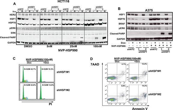 Figure 4: Combination of HSF1 knockdown and HSP90 inhibitor leads to a decreased level of p-ERK and an increased cell apoptosis rate. A. Western blotting analysis of HCT116 cells expressing the inducible shHSF1 treated with different doses of NVP-HSP990. shNTC or shHSF1 transduced HCT116 cells were treated with or without Doxycycline for 3 days and were further treated with different doses of NVP-HSP990 for 48h. B. Western blotting analysis of A375 cells expressing the inducible shRNA treated with different doses of NVP-HSP990. shNTC or shHSF1 transduced A375 cells were treated with or without Doxycycline for 3 days and were further treated with NVP-HSP990 100nM for 48h. C. Cell cycle analysis of A375 cells treated with NVP-HSP990 with or without HSF1 knockdown. shHSF1 transduced A375 cells were treated with or without Doxycycline for 3 days and were further treated with NVP-HSP990 100nM for 48h. The percentage of S+G2M cells were determined by PI staining. D. Cell apoptosis analysis of A375 cells with HSF1 knockdown and NVP-HSP990 treatment. shHSF1 transduced A375 cells were treated with or without Doxycycline for 3 days and were further treated with NVP-HSP990 100nM for 48h. The apoptotic cells represented by 7AAD+AnnexinV+ were determined by FACS.
