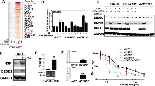 Figure 5: DEDD2 is a HSF1-target gene involved in attenuation of the effect of HSP90 inhibitor. A. Heat map showing that genes were up-regulated by HSP90 inhibitor, but the upregulation was abolished by HSF1 knockdown. shNTC or shHSF1 transduced A375 cells were treated with or without Doxycycline for 3 days and were further treated with NVP-HSP990 100nM for 3h. Total RNA were collected and microarray was performed. B. Real-time PCR analysis of the expression of DEDD2 gene in cells under HSP90 inhibitor treatment with or without HSF1 knockdown. C. Western blotting analysis of protein expression in cells treated with HSP990 and HSF1 shRNA. shHSF1 transduced A375 cells were treated with or without Doxycycline for 3 days and were further treated with NVP-HSP990 100nM for 24h. D. Western blotting analysis of DEDD2 expression in cells with over-expression of HSF1. Inducible HSF1 over-expressed cells were treated by Doxycycline for 3 day. The expression of HSF1 and DEDD2 were measured by western blotting. E. ChIP with HSF1 antibody in cells treated with NVP-HSP990. A375 cells were treated with HSP90 inhibitor for 1 hour. Chromatin was immunoprecipotated with anti-HSF1 antibody and amplified by quantitative real-time PCR using primers around HSE element of DEDD2 gene promoter. F. Dose response of NVP-HSP990 in cancer cells with knockdown of either or both DEDD and DEDD2. A375 cells were treated with or without siRNA for 2 days, then followed by treatment of a serial dilutions of NVP-HSP990 for 3 days. Total RNA were also collected and real-time PCR was performed. Relative cell growth was measured by CellTiter-Glo and normalized to DMSO-treated cells.