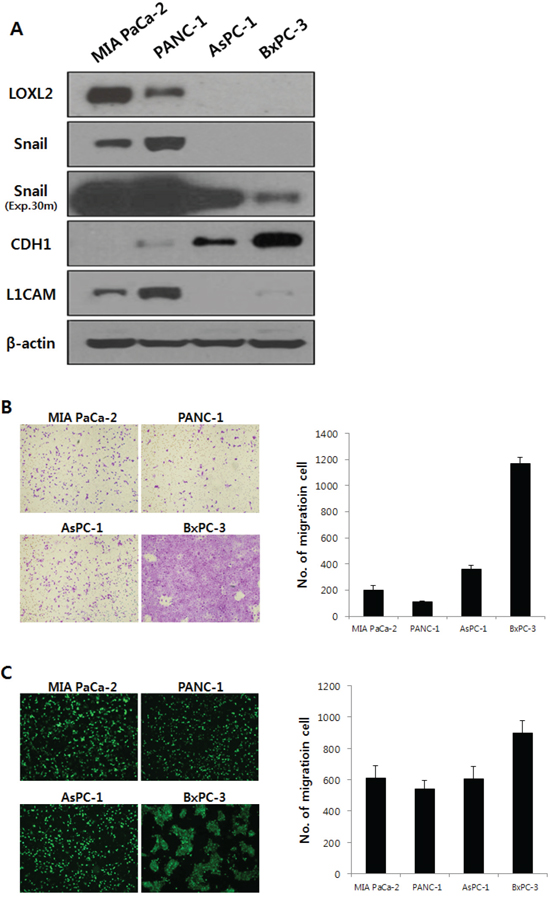 Figure 2: LOXL2 expression and properties of migration and invasiveness were analyzed in pancreatic cancer cell lines. A. on Western blot analysis, LOXL2 was only detected in MIA PaCa-2 and PANC-1. Exp.30m, Snail was analyzed after 30 minutes of exposure. Each cell showed independent properties of migration and invasiveness (B. transwell invasion assay; C. transendothelial migration assay).