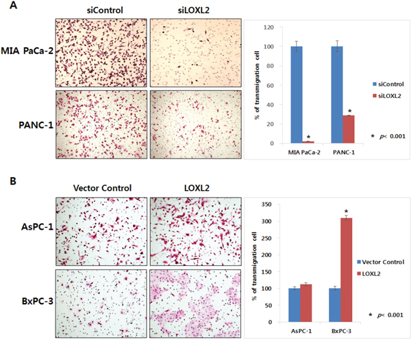 Figure 4: Effect of LOXL2 on pancreatic cancer cell invasion based on transwell invasion assay. LOXL2-silencing A. and LOXL2-overexpression B. have an effect on the capacity of motility and invasiveness of pancreatic cancer cell lines.