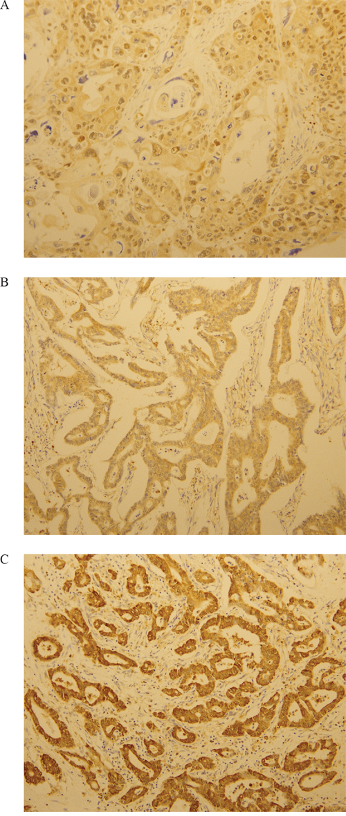 IHC staining for LOXL2 was categorized as negative, “1+”,“2+”, or “3+” in high-power fields (200x magnification) according to the intensity of cytoplasmic staining (Figure 6). LOXL2-positive status was assigned for scores “2+”and “3+”. The interpretation of IHC was evaluated by two pathologists who had no information regarding the clinical outcomes.