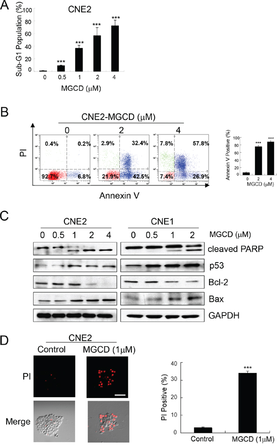 Figure 2: MGCD induces apoptosis in 2D and 3D cultured NPC cells. CNE2 or CNE1 cells were treated with indicated MGCD or DMSO (control) for 48 h. A. MGCD-induced apoptosis in CNE2 cells by sub-G1 analysis. Exposure to MGCD caused significant increases in sub-G1 DNA content of CNE2 cells at increasing concentrations. Histogram represented quantitative analysis of the percentage of sub-G1 populations from three independent experiments. Bars, SD, ***p<0.001. B. Flow cytometric analysis of apoptosis in CNE2 cells incubated with MGCD were measured by Annexin V/PI analysis. Representative scatter plots showed the distribution of Annexin V and PI staining for control and MGCD-treated CNE2 cells (left panel). Quantitative analysis of the percentage of Annexin V positive cells from three independent experiments. Bars, SD, ***p<0.001. C. Western blot analysis of CNE2 and CNE1 cells were treated with indicated MGCD concentration for 48 h for indicated antibodies. GAPDH served as loading control. D. 3D cultured CNE2 cells were incubated with DMSO (control) or 1 μM MGCD from day 4 to day 6, the spheroid structures then subjected to PI staining (red), scale bar, 50 μm. Histogram was quantitative analysis of the percentage of PI positive cells from three independent experiments. Error bars indicated the SD, ***p <0.001.