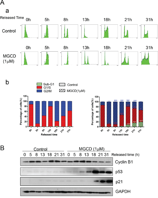 Figure 4: Time-lapse detection of CNE2 cells in the presence or absence of MGCD. CNE2 cells were synchronized by use of double thymidine for G1/S blocking, then released in control medium (DMSO) or medium containing 1 μM MGCD and incubated for various times, A. cells were stained with propidium iodide (PI), then analyzed by flow cytometry. Shown were representative histograms (a) and the number of cells in the sub-G1, G1/S, or G2/M-phase is given as percentages of the total cell population (b). Data were mean ± SD of three independent experiments, *p<0.05; ***p<0.001. B. Cell lysates were prepared and subjected to western blot analysis for Cyclin B1, p53 and p21. GAPDH was used as loading control.