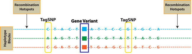 Figure 1: TagSNPs and recombination hotspots. Single nucleotide polymorphisms (SNPs) in linkage disequilibrium (LD) are coheredited in haplotype blocks. TagSNPs are used to identify gene variants potentially correlated to phenotypes, withouth the need to genotpype all SNPs included in each haplotype block.