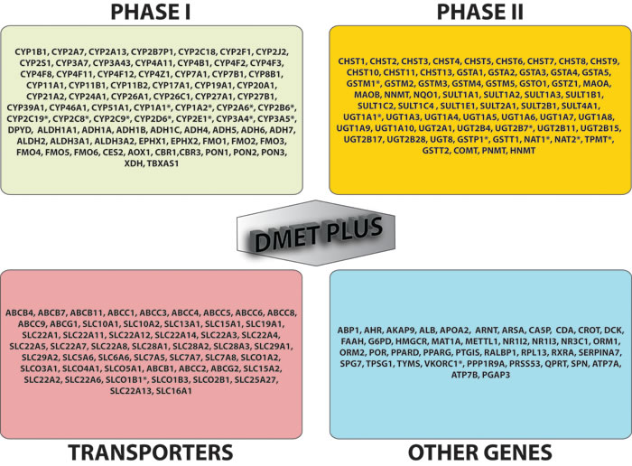 Many of the most relevant allelic variants involved in drug metabolism have been identified in the ADME genes encoding phase I-II enzymes and transporters. Phase I enzymes catalyze hydrolysis, reduction and oxidation reactions, and phase II enzymes catalyze conjugation reactions such as sulfation, acetylation and glucuronidation. The majority of phase I reactions are catalyzed by the CYP450 enzymes highly expressed in liver. There are 18 families of CYPs that can be further splitted into 44 subfamilies consisting of 57 total genes. However, only 3 of those families, CYP1, CYP2 and CYP3, catalyze most phase I reactions of drugs with close to 400 different unique alleles characterized to date (www.cypalleles.ki.se) [39]; over 75% of prescribed drugs are metabolized at least in part by 3 subfamilies, CYP3A, CYP2D6 and CYP2C. Otherwise, phase II drug metabolizing enzymes typically enable the biotransformation of endogenous compounds and xenobiotics and their excretion by considerably increasing the hydrophilicity of the substrate or deactivate highly reactive species as well as inactivate pharmacologically active compounds. Polymorphic variants of phase II enzymes are responsible of a reduced metabolizing capacity, which account for drug toxic effects. Also xenobiotics and pro-carcinogens are converted by phase II enzymes into highly reactive intermediates with potential activity as chemical carcinogens and mutagens by covalent binding to DNA. Specific SNPs in phase I and II enzymes are linked to phenotypes characterized by a metabolic state of “ultra” (UM), “intermediate” (IM) and “poor” (PM) metabolizers as referenced to wild-type individuals identified as “extensive” (EM) metabolizers. The PM phenotype is associated with the presence of null genotypes, IM phenotype is associated with reduced metabolism genotypes, while UM phenotype relies on gene duplications [40]. Key phase II enzymes are mostly transferases and include N-acetyltransferases 1 and 2 (NAT1 and NAT2), uridine disphosphate glucoronosyltransferase (UGTs), sulfotransferases (SULTs), glutathione S-transferases (GSTs), thiopurine S-methyltransferase (TPMT) and catechol O-methyl transferase (COMT). Also transporters are involved in the efflux and/or influx of drugs by active transport or facilitated diffusion and perform a critical role in ADME, affecting drug uptake, bioavailability, targeting, efficacy, toxicity and clearance. ATP-binding cassette (ABC) and solute-linked carrier (SLC) proteins are involved in the majority of drug and endogenous substrates transport. They act as efflux pumps and as typically influx transporters, respectively [41]. Figure 2 shows the list of 231 genes analyzed by DMETTM platform.