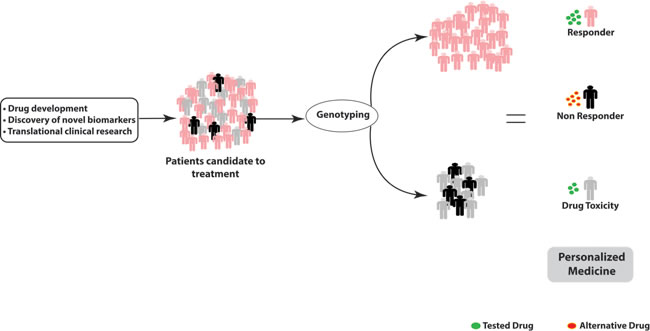 The chance to predict and avoid ADRs, especially in the case of drugs with a narrow therapeutic index, like antitumor agents, is of major relevance in the clinical practice. Although not-inherited acquired somatic mutations in tumor tissue can influence cancer progression and drug response, other genetic alterations in transcription factor activity, gene expression, gene silencing (epigenetics), and polymorphisms are the basis of individual genetic variability. So far, a variety of novel agents have been developed for targeting specific proteins and pathways, activated by somatic mutation, on the bases of genetic alterations identified in cancer cells, like mutations involving EGFR, RAS genes, B-RAF, and ALK [11]. Somatic mutations can define disease subtypes, influence the therapeutic strategies and the clinical outcome of different tumors [12]. In almost 60% metastatic colorectal cancer (mCRC) patients, K-RAS and N-RAS are mutated and mutations are considered a predictor of poor response to anti-EGFR monoclonal antibodies (mABs), such as cetuximab or panitumumab, while patients with wild-type RAS benefit from EGFR targeted treatment [13]. Also mutations in B-RAF and PIK3CA (exon 20) as well as PTEN deletions in mCRC patients with wild-type KRAS may predict anti-EGFR resistance, but are not validated for clinical decision [14]. Inherited germline DNA polymorphisms have been identified for many proteins implicated in clinical pharmacology, and may alter bio-availability, structure, binding, and/or function, with consequent impact on drug activity and disease outcome [15, 16]. Unlike other factors influencing drug response, germline determinants generally remain stable throughout lifetime and can confer high or moderate risk for cancer susceptibility controlling which somatic mutations will undergo positive and negative selection [11, 17]. For many drugs, including anticonvulsant, anti-infective, anti-tumor, cardiovascular, opioid, proton-pump inhibitor and psychotropic drugs, a correlation has been identified between genetic variants in ADME genes and drug associations at level of cytochrome P450 (CYP) enzymes, receptors, transporters, targets and, more recently, human-leukocytes antigens (HLAs) [5]. For example, genetic polymorphism in genes coding for membrane transporters (ABCG2) and metabolism enzymes (CYP3A4, and CYP3A5, CYP1A1, CYP27B1) were correlated with the occurrence of erlotinib toxicity [18-20]. Recently, in a whole-genome sequencing of high-grade serous ovarian cancer (HGSC) tissue and germline DNA samples from 92 patients in different platinum-sensitivity status, the acquired drug resistance was associated to up-regulation of the ABCB1/MDR1 gene. The possibility to prior identify patients carriers of this drug resistant factor may allow a tailored treatment with anticancer drugs that are not a substrate of MDR1[21]. In cancer treatment, the onset of drug resistance represents an unsolved problem [22-25]. Thus, the identification of SNPs correlated to individual drug response has implemented PGx studies [26] and will offer the opportunity to select new predictive biomarkers not only for targeted therapies but also to avoid side effects associated to multi-drug regimens. Important examples of tagging SNPs in genes influencing the metabolism of antineoplastic drugs are the thiopurine methyltransferase (TPMT), involved in 6-mercaptopurine metabolism and the dihydropyrimidine dehydrogenase (DPD), involved in 5-fluorouracil (5-FU) therapy. The functional deficiency of TPMT (rs1800462 (G>C), rs1142345 (A>G) and rs1800460 (G>A)) increases the serum levels of 6-mercaptopurine with consequent serious side effects, as myelosuppression [27], while reduced DPD activity leads to prolonged 5-FU half-life and increased risk of toxicity [28]. On these bases, DMETTM Affymetrix platform allows to investigate germline polymorphisms in a panel of ADME genes, approved by the Food and Drug Administration (FDA, USA) for their involvement in drugs metabolism and elimination, in order to shed light on the complex relationships between human genetics and drug response and identify new predictive biomarkers to enhance treatment efficacy and safety.