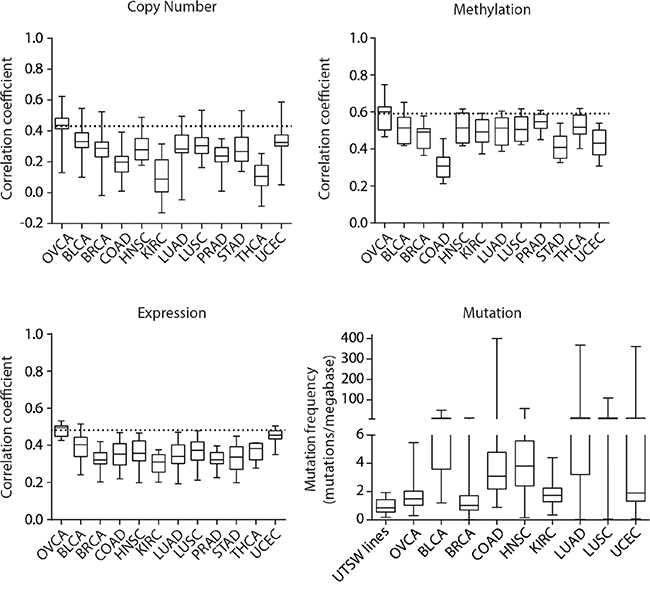 Figure 4: Pan-cancer genomic comparisons of UTSW OVCA cell lines and TCGA tumor types. Correlation analyses to assess the similarity between UTSW cell lines and the mean genomic profiles of various TCGA tumor types were conducted for copy number, DNA methylation, gene expression, and mutation data. The 2000 most variably methylated or expressed genes were assessed. For copy number, methylation, and expression plots, the horizontal dotted line indicates the average correlation coefficient observed between the TCGA OVCA tumors and UTSW cell line comparison. For mutation data, functional, somatic mutation frequencies were compared. The TCGA tumor types are indicated as follows: OVCA, bladder urothelial carcinoma (BLCA), breast invasive carcinoma (BRCA), colon adenocarcinoma (COAD), head and neck squamous cell carcinoma (HNSC), kidney renal clear cell carcinoma (KIRC), lung adenocarcinoma (LUAD), lung squamous cell carcinoma (LUSC), prostate adenocarcinoma (PRAD), stomach adenocarcinoma (STAD), thyroid carcinoma (THCA), and uterine corpus endometrial carcinoma (UCEC).