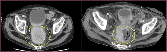Figure 2: Cross section of contrast enhanced CT scan of the pelvis (venous phase). Left image: into the yellow circle tumor before chemoembolisation; Right image : into the yellow circle the reduction size of the lesion (30 day after treatment).