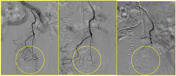 Figure 3: In yellow circle the pregressive disappearing of the tumor vascular bed during the chemoembolisation.