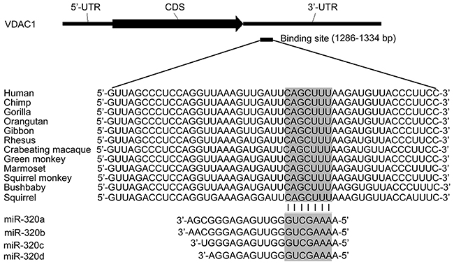 Figure 1: Bioinformatic analysis of miR-320 binding site in VDAC1 mRNA 3’-UTR. Schematic diagram of VDAC1 mRNA 3’-UTR and the potential binding site for miR-320a. The upper panel shows one potential target site on 3’-UTR of VDAC1 and the lower panel shows multiple sequence alignment of miR-320 with the binding site on 3’UTR of VDAC1.