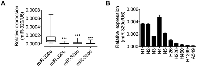 Figure 2: miR-320a is highly expressed in lung tissues and decreased in NSCLC cell lines. A. qRT–PCR analysis of miR-320a, 320b, 320c and 320d expressions in 60 NSCLC corresponding non-tumor tissues. The expression of mRNA was normalized to U6. B. The expression levels of miR-320a were measured in 5 human NSCLC cell lines and 5 nromal lung tissues by qRT-PCR, and the expression levels of miR-320a were normalized to U6 RNA expression for subsequent analyses. ***p < 0.001.
