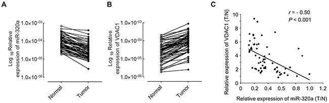 Figure 4: miR-320a negatively regulates VDAC1 mRNA expression in NSCLC samples. A. qRT-PCR analysis of miR-320a expression in 60 pairs of NSCLC tissues and their corresponding non-tumor tissues. Expression of miR-320a was normalized to U6. B. qRT-PCR analysis of VDAC1 expression in NSCLC tissues and their corresponding non-tumor tissues as indicated in (A). The expression of VDAC1 was normalized to β-actin. C. A negative Spearman correlation between miR-320a and VDAC1 mRNA levels were found in 60 NSCLC samples. T, tumor tissues; N, adjacent non-tumor tissues. ***p < 0.001.