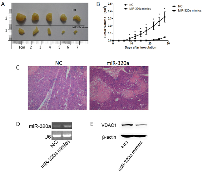 Figure 6: Effect of miR-320a over-expression on tumorigenicity. A. Tumors from Nod/Scid mice 4 weeks after inoculation. B. The curve of tumor growth. Wilcoxon signed-ranks test was used for the comparison of tumor volumes. *p < 0.05 versus NC transfectants. C. H&E staining in xenograft tumors (Scale bars: 50 μm). D. The expression levels of miR-320a in miR-320a mimics transfected tumor cells group and NC group determined by RT-PCR. E. The protein level of VDAC1 was decreased in miRNA mimics transfected tumor cells group compared to NC group when overexpressing miR-320a.