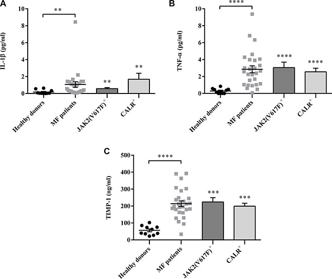 Figure 1: Regardless mutation status, the plasma levels of IL-1β, TNF-α and TIMP-1 are increased in MF patients. IL-1β (A), TNF-α (B) and TIMP-1 (C) plasma levels were measured by ELISA in MF patients. (n = 26; JAK2V617F positive n =16; CALR positive n = 10) and healthy controls (n = 15). Compared with controls, cytokines plasma levels were significantly increased in MF patients. Of note, there was no significant difference between JAK2V617F or CALR mutated patients. All data are presented as mean ± SEM (**p ≤ 0.01; ***p ≤ 0.001; ****p ≤ 0.0001).