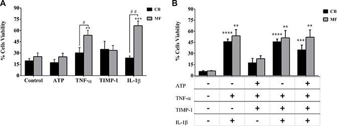 As shown in Supplementary Figure 2, the combinations of factors two-by-two significantly promoted the MF-derived CD34+ cells survival as compared with untreated cells. However, no significant differences in cell viability were observed as compared with factors alone. Interestingly, the two by two combined factors did not significantly enhance the survival of CB-derived CD34+ cells, except for IL-1β + TNF-α (p ≤ 0.01). Comparing MF vs CB-derived cells, the survival of MF CD34+ cells was significantly enhanced by IL-1β + TIMP-1 (p ≤ 0.01) and IL-1β + ATP (p ≤ 0.01).