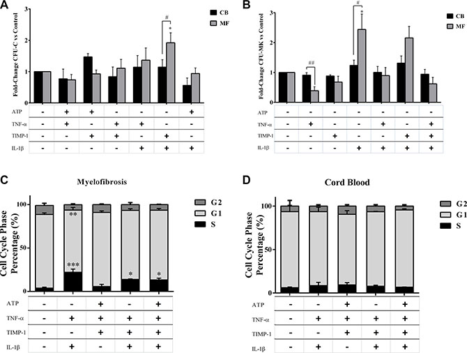 Figure 4: Proliferation of circulating MF-derived CD34+ cells is positively enhanced by IL-1β + TNF-α ± TIMP-1 combinations. Circulating CD34+ cells were isolated from MF patients (n = 20) and CB units (n = 8) and cultured in the presence of the selected two-by-two pro-inflammatory factors. After 14 days, the total CFU-C output was assessed as described in Methods (A). Circulating CD34+ cells were isolated from MF patients (n = 10) and CB units (n = 8) and cultured in the presence or absence of inflammatory factors alone or combined. After 12 days, the CFU-MK growth was assessed as described in Methods (B). The results are expressed as growth fold change versus untreated CTR samples. (A) The clonogenic output of the MF-derived CD34+ cells was significantly stimulated by the IL-1β + TIMP-1 combination as compared with untreated cells or the CB-derived counterparts. No other combinations of factors two-by-two were effective. The mean number of colonies in MF-derived and CB-derived untreated samples was 59 ± 8 and 63 ± 6, respectively. (B) The MF-derived CFU-MK growth was significantly inhibited by TNF-α. By contrast, IL-1β has stimulatory activity on MK colony formation. Factors in combination did not significantly modify the growth of patients/CB CFU-MK as compared with factors alone. Factors alone or in combination did not significantly modify the CFU-MK growth of the CB counterparts. The mean number of CFU-MK in MF- and CB-derived untreated samples was 26 ± 11 and 46 ± 10, respectively.In (C and D ) are shown the results of cell-cycle analysis of MF-derived (n = 10) and CB-derived (n = 8) CD34+ cells after in vitro incubation for 24 hours in the presence or absence of various combinations of pro-inflammatory factors. Results are expressed as the percentage of cells in different phases of the cell cycle. IL-1β plus TNF-α highly promote cell cycling of CD34+ cells from MF patients. IL-1β + TNF-α + TIMP-1 and IL-1β + TNF-α + TIMP-1 + ATP were also effective (C). Conversely, no significant differences were observed when CB-derived cells were analysed (D). All data are presented as mean ± SEM. (*p ≤ 0.05; **p ≤ 0.01; ***p ≤ 0.001 vs untreated cells) (#p ≤ 0.05; ##p ≤ 0.01 vs CB).