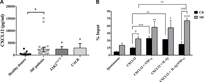 Figure 6: IL-1β and TNF-α significantly increases migration of MF-derived CD34+ cells. (A) CXCL12 plasma levels of MF patients (total n =24; JAK2V617F mutated patients n = 16; CALR mutated patients n = 8) and controls (n = 10). Regardless mutation status, CXCL12 concentration was significantly higher in MF patients (*p ≤ 0.05 vs controls). (B) When cells were migrated toward CXCL12 alone, an increased migration ability was observed in MF-derived (n = 15) CD34+ cells as compared with the CB-derived (n = 8) counterparts. The addition of inflammatory factors alone (IL-1β/TNF-α) plus CXCL12 significantly increased the migratory behaviour of MF-derived CD34+ cells as compared with CXCL12 alone. IL-1β + TNF-α synergistically enhanced the migratory behaviour of CD34+ cells as compared with spontaneous migration (****p < 0.0001), CXCL12 alone (**p <0.001) and the CB-counterpart (####p <0.0001). Results are expressed as mean percentages ± SEM of input. (**p ≤ 0.01; ***p ≤ 0.001 vs CXCL12 alone for CB-derived CD34+ cells) (*p ≤ 0.05; **p ≤ 0.01; ****p < 0.0001 vs spontaneous migration for MF-derived CD34+ cells) (#p ≤ 0.05; ####p <0.0001 vs CB).
