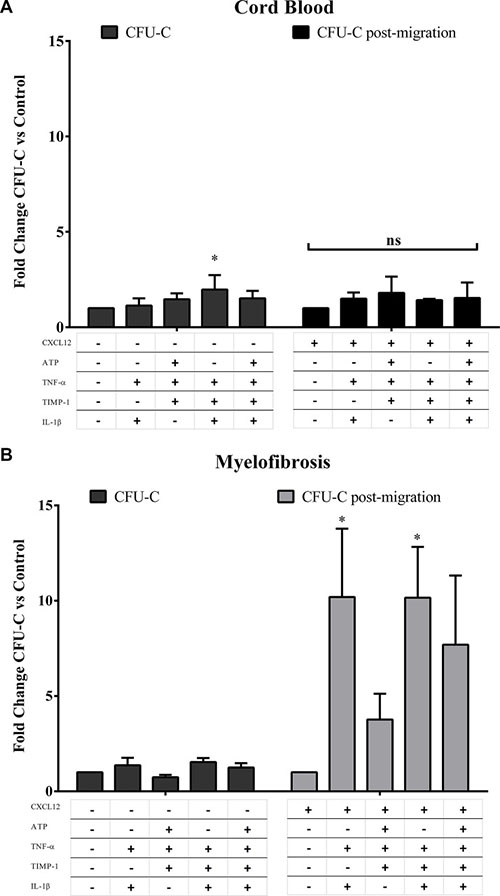 Here, we evaluated the in vitro effects of four main crucial factors of the inflammatory microenvironment (IL-1β, TNF-α, TIMP-1 and ATP) on survival, clonogenic output and migration ability of MF HSPCs.