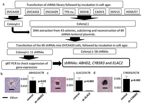 Figure 1: Schematic of functional genomics screens. a. Seven human ovarian serous adenocarcinoma cell lines and an immortalized human ovarian surface cell line HOSE/E7, all of which do not grow in soft agar, were used. Following transfection of the shRNA library, only OVCA420 cells formed colonies in soft agar. 43 colonies were successfully expanded. shRNAs were amplified by PCR and we reconstructed 69 different shRNA plasmids. Out of the 69 shRNAs in OVCA420 cells, 11 again generated colonies in soft agar. We then measured mRNA expression of these 11 genes using RT-PCR. Of the 11 shRNAs, shRNAs directed against ABHD2, CYB5R3 and ELAC2 suppressed target gene mRNA expression. b. Left: shRNA-ABHD2 transfected OVCA420 cell colony in soft agar. Black bar, 100 μm. Right: normalized ABHD2 / ACTB mRNA expression analyzed by RT-PCR. (n=3, respectively) c. Left: shRNA-ELAC2 transfected OVCA420 cell colony in soft agar. Right: normalized ELAC2 / ACTB mRNA expression. d. Left: shRNA-CYB5R3 transfected OVCA420 cell colony in soft agar. Right: normalized CYB5R3 / ACTB expression.