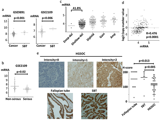 Figure 2: ABHD2 mRNA, protein expression and copy number in clinical specimens. mRNA expression was evaluated using log2 normalized values. a. Comparison of ABHD2 mRNA expression between ovarian cancer tissues and serous borderline tumors (SBT) using gene expression microarray datasets GSE9891 and GSE2109. b. Comparison of ABHD2 mRNA expression between serous adenocarcinoma and non-serous adenocarcinoma in microarray dataset GSE2109. c. Copy number alterations for ABHD2 in TCGA samples. Del; deletion, Amp; Amplification. d. Correlation between ABHD2 copy number and mRNA expression in TCGA specimens. e. Representative ABHD2 immunohistochemistry staining for HGSOC (intensity 0, 1 and 2), normal fallopian tube and SBT are shown. Comparison of H-scores among HGSOC, fallopian tube and SBT. The H-score is calculated as 2x the percentage of the most strongly stained area plus 1x the percentage of the most weakly stained area, imparting a total score ranging from 0 to 200.