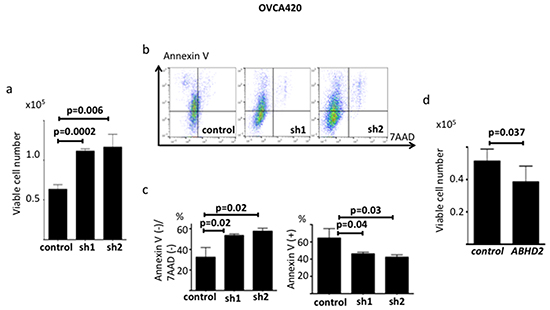 Figure 5: Functional validation of ABHD2 as a negative regulator of anoikis resistance in OVCA420 cells. a. Number of viable control, sh1-OVCA420 and sh2-OVCA420 cells following incubation on ultra-low attachment plates (n=6). b. Representative data showing Annexin V/7-ADD staining following incubation on ultralow attachment plates. c. Comparison of the ratio of the Annexin V(-)/7-ADD(-) fraction (viable cells) and Annexin V(+) fraction (apoptotic cells) between control, sh1 and sh2 cells. d. Number of viable OVCA420-control and OVCA420-ABHD2 cells following incubation on ultra-low attachment plates (n=6). Panels a-c: sh1; sh1-OVCA420, sh2; sh2-OVCA420, control; control-OVCA420; panel d: control; OVCA420-control, ABHD2; SKOV3-ABHD2.