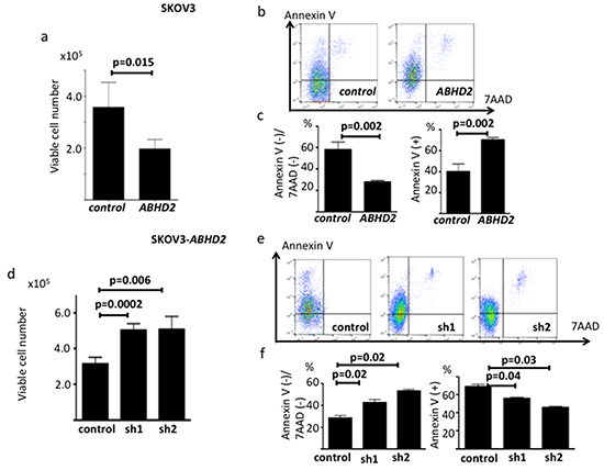 Figure 6: Functional validation of ABHD2 as a negative regulator of anoikis resistance in SKOV3 cells. a. Number of viable SKOV3-control and SKOV3-ABHD2 cells following incubation on ultra-low attachment plates (n=6). b. Representative data showing Annexin V/7-ADD staining following incubation on ultralow attachment plates. c. Comparison of the ratio of the Annexin V(-)/7-ADD(-) fraction and Annexin V(+) fraction between SKOV3-control and SKOV3-ABHD2 cells. d. Number of viable control- SKOV3, sh1- SKOV3-ABHD2 and sh2-SKOV3-ABHD2 cells following incubation on ultra-low attachment plates (n=6). e. Representative data showing Annexin V/7-ADD staining following incubation on ultralow attachment plates for 48 hours. f. Comparison of the ratio of the Annexin V(-)/7-ADD(-) fraction and Annexin V(+) fraction among control, sh1-SKOV3-ABHD2 and sh2-SKOV3-ABHD2 cells. Panels a-c: control; SKOV3-control, ABHD2; SKOV3-ABHD2; panels d-f: control; control-SKOV3-ABHD2, sh1; sh1-SKOV3-ABHD2, sh2; sh2-SKOV3-ABHD2.