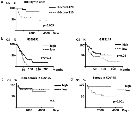 Figure 8: Overall survival of ovarian cancer patients. a. Differences in survival based on ABHD2 immunohistochemical scores (H-score) in HGSOC. b. Differences in survival based on ABHD2 mRNA expression in GSE9891 (n=285, mostly HGSOC) and GSE3149 (n=146, mostly HGSOC) datasets. Samples were divided into high (greater than the median value) and low (less than the median) expression cases. c. Analysis of HGSOC patients (n=36) from KOV-75 based on ABHD2 mRNA expression. d. Analysis of non-HGSOC patients (n=39) from KOV-75 based on ABHD2 mRNA expression. n.s., not significant.