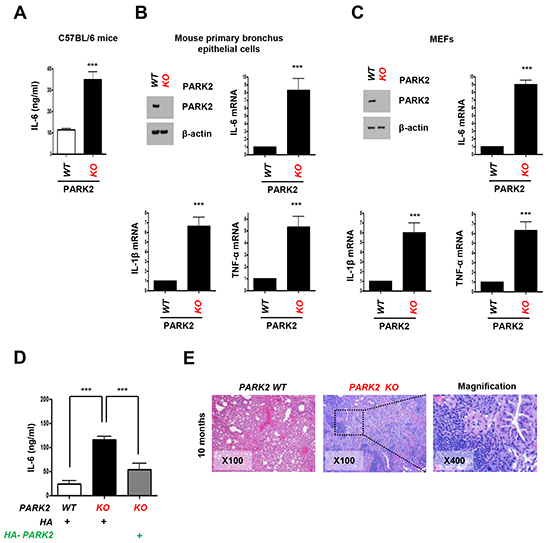 Figure 1: Loss of PARK2 maintains higher expression of cytokines for inflammation. A-C. Cytokines, IL-6, IL-1β or TNF-α protein or mRNA levels in serum from C57BL/6 mice (A), mouse primary bronchus epithelial cells (B), MEFs (C) of PARK2 WT or KO were analyzed by ELISA or qRT-PCR. D. After infection with the indicated plasmids, cytokines in the cultured MEFs supernatants were determined by ELISA. Results are shown as means (±SEM), and at least three experiments were performed for all experiments. ***,p < 0.001 by one-way ANOVA. E. PARK2 WT and KO mice (n=6) at 10 months of age were analyzed for tumor event by immunohistochemistry. H&E staining; x100 and x400.
