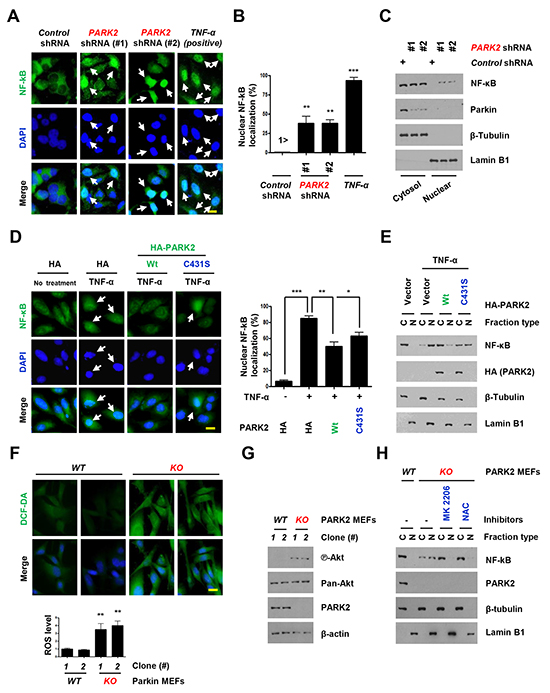 Figure 2: Overexpression of PARK2 inhibits localization of the nuclear NF-κB for inflammation. A-C. After infection with the indicated shRNAs, Primary and immortalized (BEAS-2B) human bronchial epithelial cell lysates were fixed for immunofluorescence assay or blotted with the indicated antibodies. (A) Representative images of the cells with indicated localization of the nuclear NF-κB (white arrows). Cells were fixed and stained with DAPI. TNF-α-treated cells were shown as positive controls. Scale bar, 20 μm. (B) Analysis of numerical nuclear NF-κB events. 100 cells were counted in each experiment. **, p < 0.01 and ***,p < 0.001 by one-way ANOVA. (C) Immunoblot analysis with indicated antibodies after nuclear fractionation. D. After transfection with the indicated plasmids, Beas-2B cells were selected by G418 to select stable transfectants, cells were treated with TNF-α and cells lysates were fixed for immunofluorescence assay or cell lysates were analyzed immunobloting. Representative images of the cells with indicated localization of the nuclear NF-κB (white arrows). Cells were fixed and stained with DAPI. TNF-α-treated cells were shown as negative controls. Scale bar, 20 μm. Quantification of the nuclear NF-κB localization. Results are shown as means (±SEM), and at least three experiments were performed for all experiments. *, p < 0.05, **, p < 0.01 and ***, p < 0.001 by one-way ANOVA. E. After nuclear fractionation, NF-κB, Lamin B1 and β–tubulin expression was measured by immunoblot. Lamin B1, nuclear marker; β–tubulin, cytosol marker. F. Cells were stained with DCF-DA, fixed and analyzed by immunofluorescence. G. Cells were harvested and analyzed by immunobloting. H. Cells were treated with the indicated chemicals, MK 2206 (an allosteric Akt inhibitor) or NAC (ROS scavenger). After nuclear fractionation, NF-κB, Lamin B1 and β–tubulin expression was measured by immunoblot. Lamin B1, nuclear marker; β–tubulin, cytosol marker.