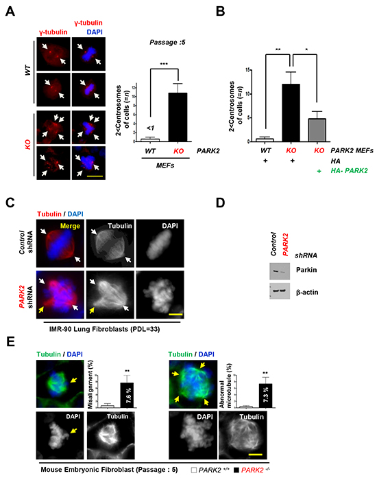 Figure 3: Deletion of PARK2 induced chromosome instability. A. PARK2 deficiency results in centrosome amplification in MEFs at passage 5. (left) Immunofluorescence staining shows impaired mitoses in MEFs depleted of PARK2. Red, γ-tubulin; White arrows, centrosome in mitosis. The scale bar is 20 μm. (right) Quantification of 2 < centrosomes cells. ***, p < 0.001 by one-way ANOVA. n=10. B. After infection with the indicated plasmids, MEFs lysates were fixed for immunofluorescence assay. Quantification of 2 < centrosomes cells using γ-tubulin. Results are shown as means (±SEM), and at least three experiments were performed for all experiments. *, p < 0.05 and **, p < 0.01 by one-way ANOVA. C. Immunofluorescence staining shows impaired mitoses in IMR 90 lung fibroblast cells depleted of PARK2. White arrows, centrosome in mitosis. Yellow arrows, abnormal chromosome. The scale bar is 20 μm. D. Cell were harvested at indicated times and analyzed by immunobloting. E. Impaired mitoses including multipolar spindles, misalignment and abnormal microtubule in PARK2 knockout (KO) MEF cells. Yellow arrows, abnormal chromosome. The scale bar is 20 μm. Results are shown as means (±SEM), and at least three experiments were performed for all experiments. **, p < 0.01 by one-way ANOVA.