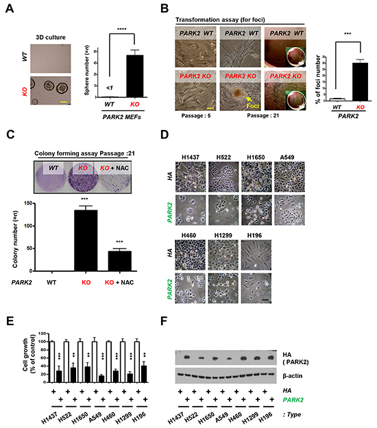 Figure 4: PARK2 loss leads to tumor initiation and overexpression of PARK2 inhibits cell proliferation in lung cancer cell lines. A. Primary MEFs were applied on 3-D cultures system for 2 weeks and counted the sphere of the cells. (top) Representative images indicate the sphere cells. (bottom) Quantification of the sphere number. ****, p < 0.0001 by one-way ANOVA. n=6. (B. and C.) PARK2 WT and KO MEFs were analyzed for foci formation at passage 5 and 21 (B), and colony formation at passage 21 C. The scale bar is 20 μm. Results are shown as means (±SEM), and at least three experiments were performed for all experiments. NAC, ROS scavenger. ***, p < 0.001 by one-way ANOVA. D. The growth of lung cancer cell lines (H1437, H522, H1650, A549, H460, H1299 and H196) was inhibited through infection with PARK2. Cells were transfected with the indicated plasmids, and then cell lysates were blotted with the indicated antibodies. E. The percentage of lung cancer cell growth compared to controls after transfected PARK2. Results shown as means (± SEM), and at least three experiments were performed for all experiments. **, p < 0.01 and ***, p < 0.001 by one-way ANOVA. F. PARK2 and β–actin expression was measured by immunoblot.