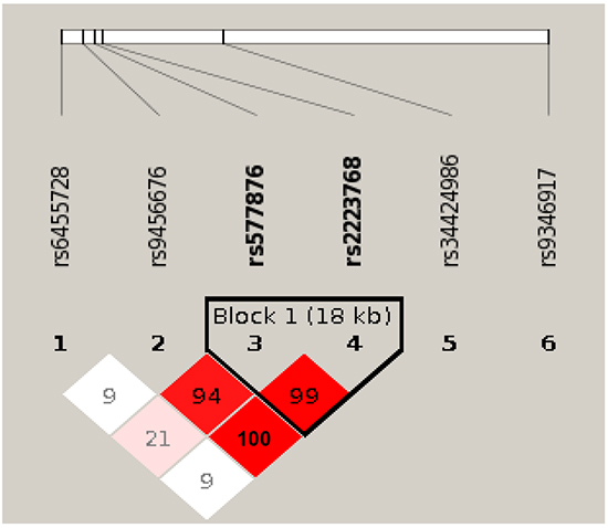 Figure 5: Linkage disequilibrium (LD) plot of 6 SNPs in PARK2 gene. Among the six SNPs, five (SNPs 1-4 and 6) are tested significant in our Model 4 that comparing cases with lung cancer and chronic obstructive pulmonary diseases (COPD) to controls with COPD only. One SNP rs34424986, which was recently reported from an independent study [24] but not included on GWAS panels, is shown relative position among the five tested significant SNPs. Numbers shown in blocks are D’ values (i.e., D’x100; 99 means D’ = 0.99), which measures the strength of LD between two neighboring SNPs. The higher of D’ value, the more statistically associated between two SNPs. Because the high LD between rs9456676, rs577876 and rs2223768, final results of penalized regression model removed two SNPs (rs9456676 and 2223768). LOD, means logarithm of odds score, is a statistical test used in genetic linkage analysis. Legends: White - D’<1, LOD <2; Pink shades - D’<1, LOD ≥ 2; Red - D’ =1, LOD ≥ 2;None: SNPs not correlated.