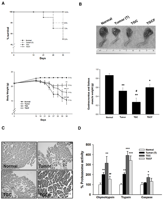 The survival rate was higher in the TGCF group than in the TGC group (70% vs 50%) (Figure 2A). At the end of the study, the mice in the T group lost 5.2±0.9% of their initial body weight, whereas those in the normal group gained body weight. The mice in the TGC and TGCF groups lost 28.3±1.8%, and 16.2±1.2% of their initial body weight, respectively (Figure 2A). Similarly, compared with the TGC group, the loss of gastrocnemius and soleus muscle mass (Figure 2B), and muscle atrophy evaluated by histological examination (Figure 2C) were remarkably reduced in the mice of TGCF group. Moreover, a marked increase of muscular proteasome activity, particularly chymotrypsin, was observed in the TGC group mice, whereas this activity was attenuated in the TGCF group mice (Figure 2D).
