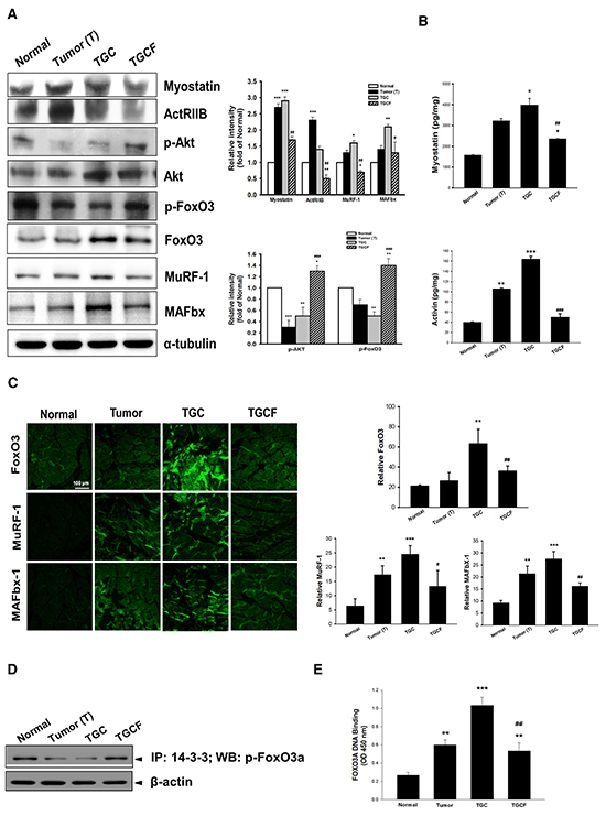 Figure 3: Effects of LMWF on muscle proteolysis-related gene expression. The atrogenic gene expression A. and the formation of myostatin, and activin A B. in muscle were determined. The amounts of FoxO3, MuRF-1 and MAFbx determined by immunofluorescence staining assay C. and the association of p-FoxO3a with 14-3-3 chaperone protein D. FoxO3a transcription factor activity E. in skeletal muscle were examined. Data was expressed as mean ± SEM (n=5-10). *P < 0.05, **P < 0.01, ***P < 0.001 versus normal group. #P < 0.05, ##P < 0.01, ###P < 0.001 versus TGC group.
