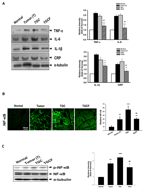 Figure 4: Effects of LMWF on pro-inflammatory cytokine expression and NF-κB activation. The protein levels of pro-inflammatory cytokines, CRP, A. and NF-κB B. and phospho-NF-κB C. in muscle were determined by immunofluorescence staining or Western blotting assay. Data was expressed as mean ± SEM (n=5-10). *P < 0.05, **P < 0.01, ***P < 0.001 versus normal group. #P < 0.05, ##P < 0.01 versus TGC group.