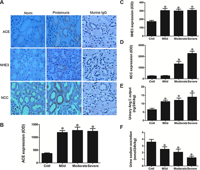 Figure 6: Analyses of ACE, NHE3, NCC, Ang II, and urinary sodium excretion in the proteinuric patients. (A) Immunohistochemistry of ACE, NHE3, and NCC demonstrate enhanced tubular expression of these elements in proteinuric kidney. (B) Semi-quantitative measurement of ACE immunoreactivity. (C) Semi-quantitative measurement of NHE3 immunoreactivity. (D) Semi-quantitative measurement of NCC immunoreactivity. (E) Urinary Ang II excretion was stimulated in proteinuric patients. (F) Urinary sodium excretion was reduced in proteinuric patients. The values represent the means ± SDs. For urinary Ang II assay, n = 12–33 in each group. In other experiments, n = 6 in each group. *p < 0.01 vs. control group.