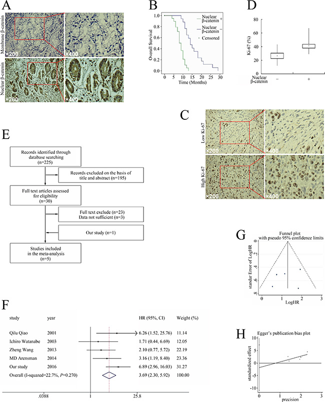 Figure 1: Relationship between aberrant β-catenin pathway activation and pancreatic cancer prognosis. (A) Distribution of β-catenin in pancreatic cancer. (B) Nuclear β-catenin expression correlated with tumor characteristics and clinical outcomes of pancreatic cancer. Kaplan–Meier plot of OS stratified by nuclear β-catenin. (C) Ki-67 expression in pancreatic cancer. (D) The association of nuclear β-catenin and Ki-67 infiltration in pancreatic cancer cells. (E) Flow chart of studies included in the meta-analysis. (F) Meta-analysis of effects of β-catenin on OS in pancreatic cancer. (G) Funnel plot for the outcome of OS. (H) Egger’s publication bias plot.