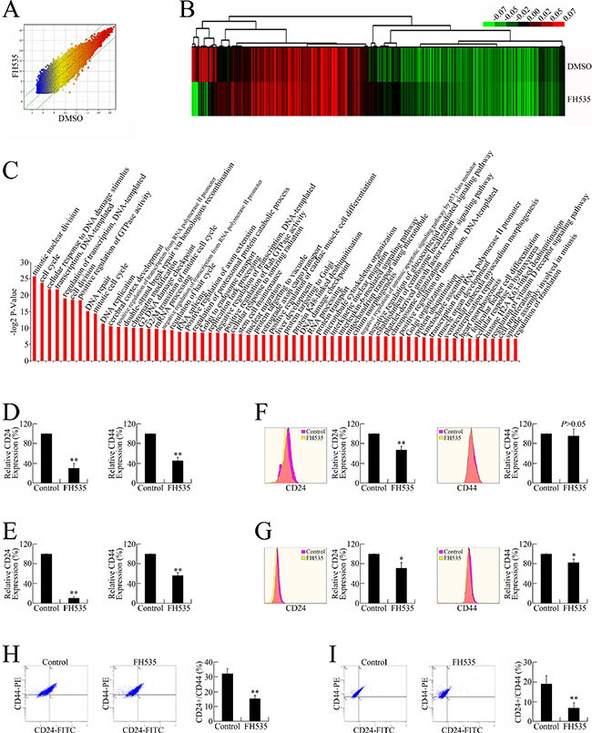 Figure 3: FH535 repressed pancreatic cancer cell stemness. (A) Microarray analysis of the global expression profiles of control and FH535-treated groups. The scatter plot was used for assessing the gene expression variation (or reproducibility) between arrays. The X-axis (Control) and Y-axis (FH535) values in the scatter plot are the normalized signal values of the samples (log2 scaled). (B) Heat map of the differential gene expression patterns (fold change ≥ 1.5). (C) GO analysis of differentially expressed genes. (D) FH535 repressed CD24 and CD44 mRNA expression in PANC-1 cells. (E) FH535 repressed CD24 and CD44 mRNA expression in CFPAC-1 cells. (F) FH535 repressed protein expression of CD24 but not CD44 in PANC-1 cells. (G) FH535 repressed CD24 and CD44 protein expression in CFPAC-1 cells. (H) FH535 downregulated the PANC-1 cell CD24+/CD44+ subgroup. (I) FH535 decreased the CFPAC-1 cell CD24+/CD44+ population.
