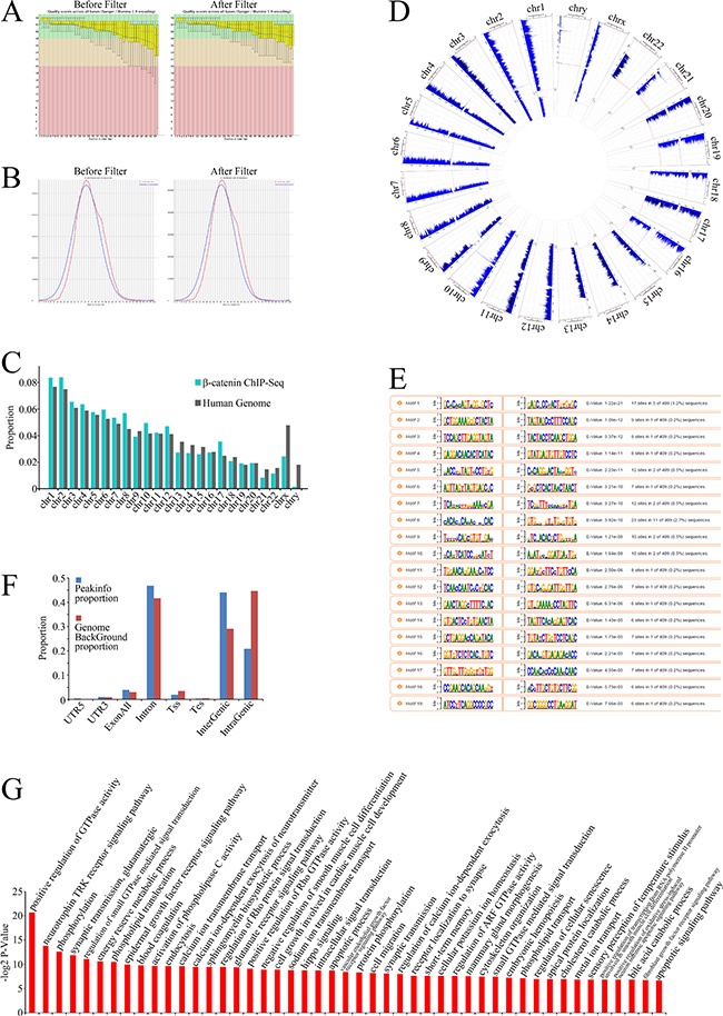 Figure 4: β-Catenin ChIP-Seq data analysis. (A) Box plots of base call quality scores across all bases before (left) and after (right) filtering were obtained using an Illumina GA II sequencer. Green and red areas, quality scores > 28 and < 20, respectively. Yellow boxes, upper and lower quartiles; whiskers, 10% and 90% quartiles. Red horizontal lines, median value. Blue curves, mean quality scores. Quality scores were given based on Phred-scaled quality values calculated using q = −10log10(P), with P being the estimated error probability for that base call. (B) Overview of mean GC distribution over all sequences for samples before (left) and after (right) filtering. Red curves, GC content per read; blue curves, theoretical distribution. Horizontal axis corresponds to mean GC content (%); vertical axis corresponds to GC content. (C) Proportion of ChIP-Seq reads uniquely mapped to each chromosome. (D) Chromosomal distribution of ChIP-Seq reads across all chromosomes. (E) Proportion of ChIP-Seq reads uniquely mapped to eight human genomic regions: 5′UTR (untranslated region), CDS (coding sequence), 3′UTR, exon all, introns, Tss (transcription start site), Tes (transcription end site), intergenic or intragenic regions. (F) Motif analysis of ChIP-Seq data. The nucleotide frequencies of the genomic sequences aligned at the top-scoring 15 motifs are shown in a sequence logo representation. (G) GO analysis of identified target genes.