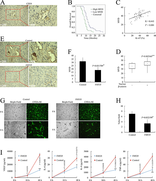 Figure 5: Nuclear β-catenin expression correlated with angiogenesis in pancreatic cancer. (A) CD34 expression in pancreatic cancer cells. (B) Kaplan–Meier plot of OS stratified by MVD. (C) Association of MVD with Ki-67 infiltration. (D) Association of nuclear β-catenin with MVD. (E) Immunohistochemical examination of pancreatic orthotopic xenografts by using CD34 antibody. (F) FH535 treatment decreased MVD level in pancreatic orthotopic xenografts. (G) Images of HUVEC tube formation assay for angiogenesis in vitro. (H) HUVEC tube formation assay evaluation of FH535 inhibition of angiogenesis in vitro. *P < 0.05, significant differences vs. control group. (I) Milliplex assay of secreted proangiogenic factors in culture medium after treatment with 20 μM FH535. *P < 0.05, **P < 0.01, significant differences vs. the respective control groups.