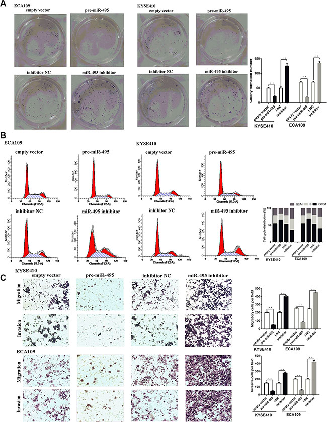 Figure 2: miR-495 inhibits ESCC progression in vitro. (A) Representative images (left) and quantifiation (right) of ESCC cell colonies, as determined by colony formation assay after transfection. The over-expression of miR-495 significantly reduced the colony formation number of ESCC cell lines. Conversly, down-regulation of miR-495 improved the colony formation number of ESCC cell lines (B) Representative images (left) and quantifiation (right) of flow cytometry analysis of ESCC cells after transfection. Cell cycle analysis revealed that miR-495 has influence the proliferation of ESCC cells by regulating its cell cycle. (C) Representative images (left) and quantifiation (right) of migratory and invasive cells per field after transfection. miR-495 significantly depressed the migratory or invasive cells per field.